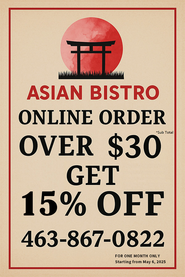 Starting from May 6, 2025, enjoy 15% OFF on all online orders of $30 or more! This limited-time offer is available for one month only, so don’t miss your chance to indulge in your favorite Asian flavors at a great discount. Order online today and enjoy the savings!